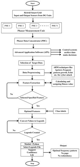 Smart meters, MTUs, RTUs, PDCs, and other devices will be sensing the high volume of current and voltage produced by DG units. This dataset must include both invasion and attacked signals. The sequential selection, preprocessing, transformation, data mining, interpreting, and evaluating database procedure used in this study makes use of the knowledge discovery database. Data cleaning is the process of eliminating noisy and useless data from a collection. The term data integration refers to the combining of heterogeneous data from various sources into a single source, such as the fact that the same attacks occurred repeatedly in the same DG. The extract-load-transformation method is used for data integration. Data selection is the process by which data from the data collection, such as FDIA, plug or play, communication latency, load change, and link failure, that are determined to be pertinent to the analysis are chosen and retrieved. Data transformation is the process of converting data into the format needed for mining operations, such as values or legends. A method used to extract potentially relevant patterns is known as data mining. Identification of strictly increasing patterns that indicate knowledge based on predetermined metrics is the definition of pattern evaluation. The term knowledge representation refers to a method for visualizing data mining outcomes such as support, lift, and confidence. The data mining outcomes were calculated by using the following method.