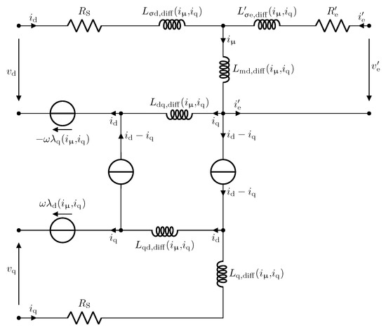 The EESM is modeled in a dq reference frame with the d-axis in the direction of rotor flux and the q-axis rectangular to the d-axis (quadrature component). Due to this definition, the rotor’s electrical excitation is on the d-axis. In the following, the voltage equation of the EESM and the modeling as T-Equivalent Circuit (EC) are derived shortly. A detailed description is given in [23] (also considering saturation) and [16,24].