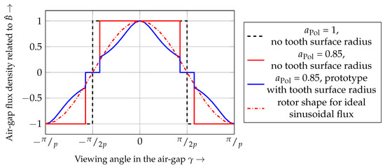 A constant air-gap and an ideal maximum pole width results in a perfect rectangular air-gap flux density; see the blue dashed line in Figure 3. This results in the fundamental winding factor of 1, the maximum winding factor. This geometry is not feasible for classical winding methods (a slot is needed) and has high harmonics. For ideal rectangular air-gap flux density, the 5th is 20%, and the 7th is 14.2% of fundamental winding factor, which results in high torque ripple (due to Y-wiring, the third harmonic is suppressed).