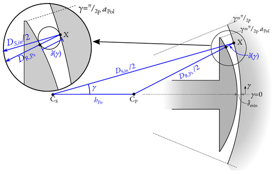 An additional rounding of the rotor tooth is used for the prototype machine to reduce especially the fifth harmonic. In Figure 4, an example of the rounded tooth shape is shown, and geometric variables are defined. A higher tooth rounding, as used for the prototype, is drawn to highlight the effect of the rounding. The viewing angle-dependent γ magnetic air-gap length δ is determined with the pole offset height hPo, the diameter of the pole surface DR,Ps, and the stator inner diameter DS,in as