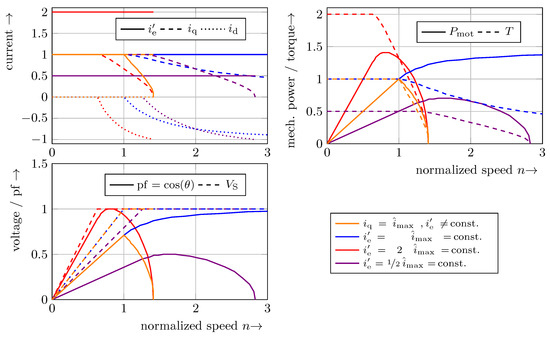 In Figure 5, the currents, torque, power, voltage and power factor are plotted over speed. The variables are related to their value at the corner point. The blue line shows the result for the previously derived optimal condition: = max = const. and = max. It can be shown that the power factor also increases in field weakening. Hence, the maximum power in field weakening is higher than at the corner point.