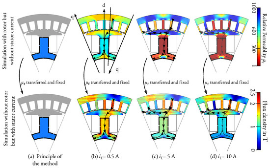 Simulation with frozen permeability method for different excitation currents. (a) Shows the principle of the method: simulations on the top are performed without stator current. The permeability in the marked region is frozen and used for the simulation with stator but without rotor current. (b–d) Shows the permeability of the iron without stator current (left) and the resulting flux density considering stator current (iq = −id = 150 A, ie = 0 A). On the bottom side, the flux density vector is plotted in red. Additionally, the preferred flux paths are highlighted with black arrows.