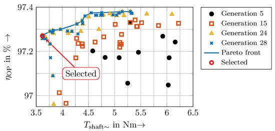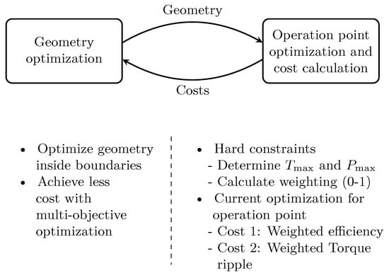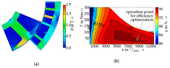 Optimization methods for EMs for EVs have been presented in the literature in recent years for PMSMs, or PMASR [5,17,18,19,20,21,22]. In these publications, several driving cycles are used. This depends mainly on the current valid driving cycle in the region where the work is conducted. Sometimes several cycles or measurements are taken into account. Mainly, the backward calculation is used: the torque requirement is derived from a given speed with a vehicle model. The driving cycles are often reduced to a few operation points.