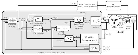 With Electrically Excited Synchronous Machines (EESMs), the power density is increased compared to IMs while having the same benefit of an adjustable rotor excitation due to the winding on the rotor. This machine type has been used rarely in the past in EVs (only for Renault Zoe/Smart EQ) but is well-known as a generator (e.g., in hydroelectric or wind power plants). BMW uses EESMs as a platform for new EVs, see [7]. The disadvantages of EESMs are the manufacturing process of the rotor and the transmission of the energy onto the rotor. Slip rings transmit the electrical power onto the rotating rotor windings. In research and the literature, several concepts with a Wireless Power Transfer (WPT) system are discussed, called Inductive Electrically Excited Synchronous Machines (iEESMs), see [8,9,10,11,12,13,14,15,16]. The systems could be divided according to their operation frequency (<20–30 kHz and >100 kHz). In several publications, only the WPT system is investigated and could be used as a retrofit for an existing EESM to replace slip rings.