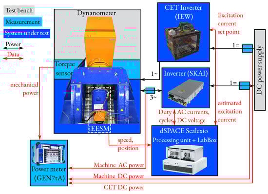 Figure 16 shows the setup on the test bench at the Institute of Electrical Energy Conversion (IEW). The test bench is driven speed-controlled, and the iEESM is torque-controlled. The power is measured with HBM’s power meter GEN7tA. The machine is operated with Semicron’s three-phase voltage source inverter SKAI 45 A2 GD12-WQI. Except for the current measurement, the inverter used is the same as [35]. dSPACE’s scalexio system is used to realize the control system, consisting of a processing unit and a LabBox (for IOs).