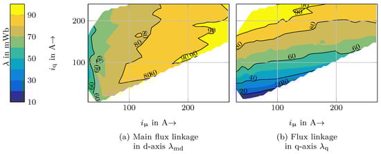 In Figure 17, the measured flux linkage maps are plotted over magnetization current iµ and q-current iq. Regarding Section 2, the number of measured operation points is reduced significantly. Only id-ie-combinations with positive magnetization current iµ are measured because negative magnetization is irrelevant. Furthermore, operation points with low q-current iq and high magnetization current iµ are not optimal. Hence, only operation points with iq/iµ ≥ 0.5 are measured.