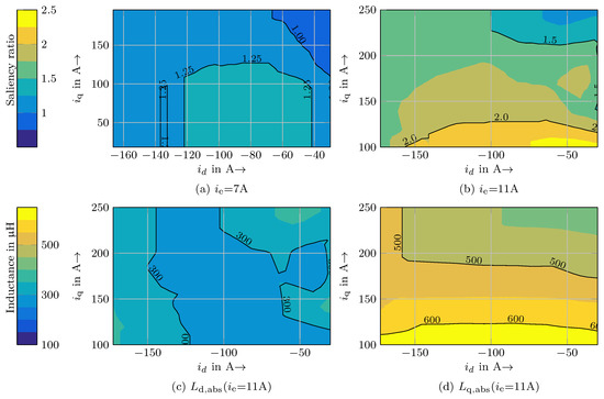 The saliency ratio Lq,abs/Ld,abs is plotted as an example for ie = 7 A and ie = 11 A in Figure 18a,b. It shows that for both excitation currents, the q-axis inductance is greater than the d-axis inductance (Ld,abs < Lq,abs, saliency ratio ≥1) for most current combinations. As described in Section 2, this positively impacts the efficiency of field weakening operation. A maximum saliency ratio of 2.5 is achieved. The saliency ratio increases with the excitation current. This is consistent with the theoretical investigations and the optimization shown in this work. Additionally, in Figure 18c,d, the measured absolute inductances Ld,abs and Lq,abs are visualized. Lq,abs is mainly depended on iq while Ld,abs is more or less constant. The d-axis inductance is mainly saturated due to the excitation current ie = 11 A (maximum is ie = 20 A).