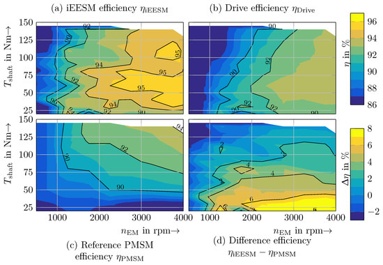 (a,b) measured efficiency with operation strategy MTPA on the test bench, (c) results from reference PMSM [31], (d) difference in efficiency ηiEESM − ηPMSM.