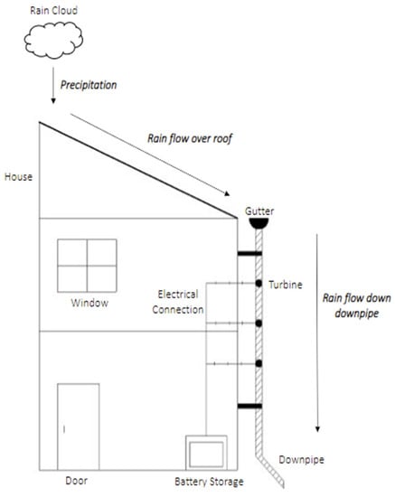 To find the rate of flow of water over the turbine, the flow rate across the roof and in the gutter must first be determined. The average rainfall in the UK is 1154 mm/year per m2 (3.205 mm/day) [11], and the average area of a roof in the UK is 73.49 [23]. Therefore, the flow rate of rainwater over the roof can be calculated as 2.726 × 10−6 , and the velocity can be calculated as 3.39 × 10−3 , assuming that the gutter is half full.