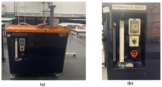 Figure 2. Experimental work: (a) experimental setup; (b) hydraulic bench control panel. - A small inlet pipe, of diameter 11 mm, was used to direct the flow of water from the bench into the pipe and was held in place using clamps.