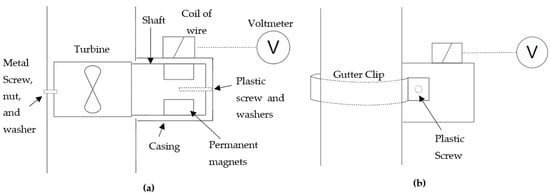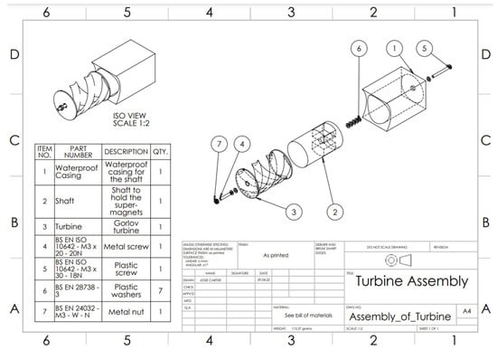 Screws were secured to the turbine device but allowed to rotate freely in the holes created in the pipe, thus acting as a rotating shaft while also supporting the structure, as shown in the assembly drawing (Figure 7) and schematics (Figure 8a). A 6 mm diameter, 30 mm length steel screw with a washer was used on the turbine side and was secured using a nut. However, on the shaft side, a 6 mm diameter, 30 mm length plastic screw and washers were used to prevent divergence or blockage to the magnetic field from a magnetic metal screw [28]. The plastic screw was super-glued into the shaft, and 10 plastic washers of 1 mm thickness were placed on the screw between the casing and the shaft to prevent movement backwards and forwards.