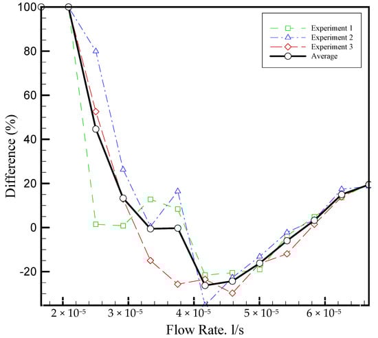 The data show that the turbine did not begin to rotate until a flow rate of 0.25 × 10−5 L/s was applied. This is because the starting torque of the turbine was not met below this flow rate; hence, the turbine could not rotate. In Figure 10, it can be seen that, for flow rates below 0.270 × 10−5 L/s, the percentage difference spiked above 30%. This was expected because the theoretical results did not consider the starting characteristics of the turbine and, hence, overestimated the output EMF of the system at the lower flow rates.