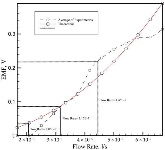 Overall, the graph shows that the theoretical calculations can be used to accurately estimate the EMF output of the turbine system for flow rates between 0.280 × 10−5 and 0.667 × 10−5 L/s, with less than 20% difference between the experimental and theoretical results.
