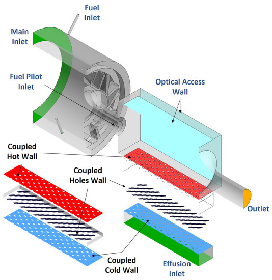 - Berger, S.; Richard, S.; Staffelbach, G.; Duchaine, F.; Gicquel, L. Aerothermal prediction of an aeronautical combustion chamber based on the coupling of large eddy simulation, solid conduction and radiation solvers. In Proceedings of the Turbo Expo: Power for Land, Sea, and Air, Montreal, QC, Canada, 15–19 June 2015; American Society of Mechanical Engineers: New York, NY, USA, 2015; Volume 56710, p. V05AT10A007. [Google Scholar]