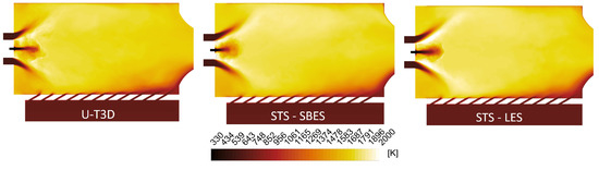 The time-averaged temperature maps, obtained by the STS method and by the U-THERM3D simulation from [28], are shown in Figure 15. It can be seen that the three simulations were in agreement with each other, but by focusing on the IRZ, the impact behavior of the pilot fuel jet has on the entire combustion chamber was, once again, evident. The temperatures in the flame tube were higher in the simulations conducted with the STS than in the U-THERM3D simulation. From these, it could be observed that the pilot jet of fuel, although it had a penetrating behavior, had a greater diffusion within the primary region increasing the reactive process rate. Comparing the two STS simulations, it could be observed that a more intense reaction occurred near the shear layers of the swirled flow in the LES calculation favored by the increased mixing near the bluff body already described by the analysis in Figure 11.