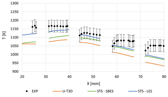 As can be seen from the one-dimensional wall temperature profiles in Figure 19, the difference between the numerical results and the experimental measurements greatly reduced for the STS–LES simulation. The data in the graph was discontinuities where the plate symmetry plane cut the effusion cooling holes. The beginning of the measurement portion of the effusion-cooled plate was located near the outer recirculation zone (ORZ). From what is seen in Figure 11, the vortex reproduced by the LES simulation was the one closest to the experimental. The higher vortex intensity brought greater recirculation of burned gas and, consequently, an increase in local temperature. The temperature peak reached near 40 mm was well predicted by the LES simulation, which presented the greatest swirling flow-cooling air interaction, that led to a significant impingement on the cooled wall. In this portion of the plate, the results differed from experimental results by 15 K. On the contrary, the SBES simulations presented the same temperature level at the beginning of the plate, which was lower with respect to the one computed by the STS–LES calcualtion. However, the simulation with STS had a more pronounced thermal gradient, due to the higher reactivity in the primary zone generated by the faster mixing of the fuel pilot jet. As seen from Figure 15, the STS simulations had higher temperature zones near the walls propagating from the high reactivity region of the IRZ. This once again confirmed how complex the flow and thermal fields of this academic combustor were, and how the pilot fuel jet modeling was a key aspect in correctly predicting not only the velocity and temperature of the gas phase inside the combustion chamber, but also the thermal flux reaching the walls.