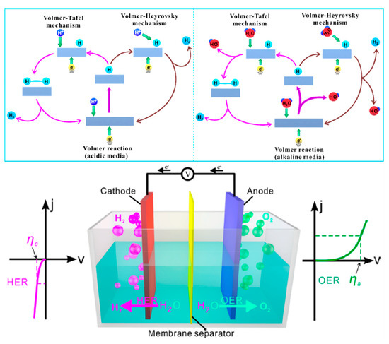 Figure 1. Schematic representation of the mechanism of H2 evolution in acidic and alkaline conditions and water-splitting reaction [34]. Reproduced with permission from Zhu et al., Chem Rev., American Chemical Society (ACS), 2020.
