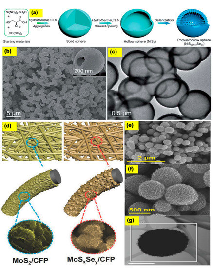 Figure 5. (ac) Nanosphered ternary NiS2(1-x)Se2x, and (dg) Nanospheroid MoSxsey [73,74]. Reproduced with permission from Zeng et al., J Mater Chem A, Royal Society of Chemistry (RSC), 2019 and Bose et al., Small, Wiley, 2018.