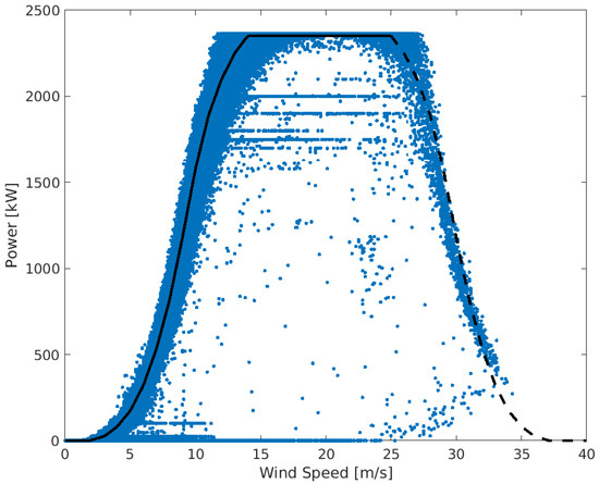 The matrix completion method was applied to the historical dataset coming from the SCADA system of a real wind farm located in Kedros, Greece. The system includes six Enercon E-82 (2.3 MW) wind turbines. The manufacturer provides a datasheet containing the ideal turbine power curve, i.e., how the generated power depends on the wind speed. The ideal power curve is plotted in black in Figure 1, overlapping the real measured data (blue dots).