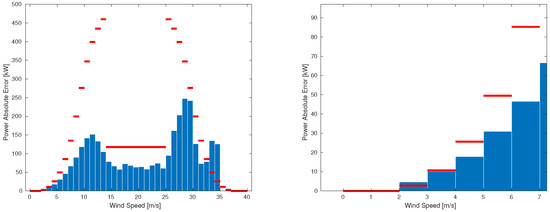 Figure 2 shows that the mean average error (MAE) is within the power band, represented by the red lines, except for data corresponding to wind speed of the order of . The MAE is computed with respect to the ideal value in the power curve.