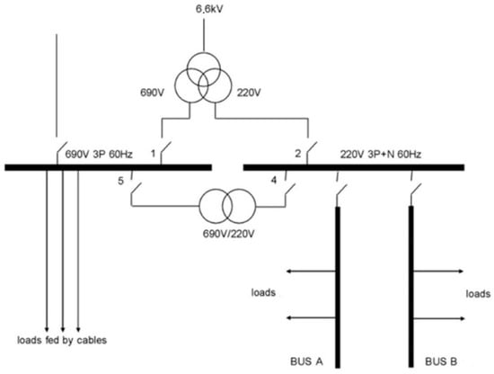 The study presented in this paper is related to a sample cruise ship, whose main features are summarized in Table 1. The original SPS was conceived according to a typical integrated power system (IPS) scheme. The primary medium-voltage (MV) distribution was at 6.6 kV AC. The 690/220 V AC secondary low-voltage (LV) distribution supplied accommodation zones, galleys, and auxiliary services. In particular, the ship has four accommodation substations (ACC1-4) and two galleys. Each accommodation substation had its own MV/LV transformer, whereas both galleys were under a single MV/LV transformer. Figure 1 shows the breakdown of the original LV distribution system downstream of one of the substation transformers supplying hotel loads.