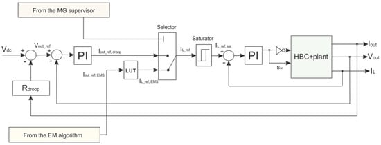 It is worth highlighting the general features of the control system used for the HBC power converters that interface the two power sources with the DC bus. As shown in Figure 3, a current loop is needed in both droop-mode and current-mode operation to regulate the input current of the HBC, which is the inductor current IL. This way, the inductor current reference IL_ref can be routed through a saturator to allow respecting the power limits of the FC and the battery as per Requirement 3. Such a reference can be generated in two ways. In the case of current-mode control, the EM algorithm decides the optimal output current reference Iout_ref,EMS, which is then converted to an optimal inductor current reference IL_ref,EMS using a look-up table. On the other hand, in the case of droop control, the inductor current reference IL_ref,droop is directly generated by the control loop that regulates the output voltage Vout. Finally, the reference Vout_ref for the voltage loop is computed through a third control loop that implements the chosen droop characteristic given the rated DC MG voltage Vdc and the droop resistance Rdroop. Overall, the controller must limit voltage deviations under ±10% during transients and under ±5% at steady state.