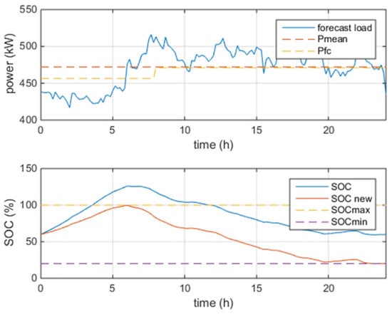The reshaping criterion used by the EM algorithm can be explained by referring to a sample day of the recorded dataset. The forecasted load demand and its average value Pmean are shown in the first graph of Figure 4 in blue and orange, respectively. By considering these curves, the profiles of the power and energy delivered by the battery can be computed. Then, it is possible to determine the SOC evolution in the following 24 h based on the initial SOC at midnight, e.g., SOC0 = 60%. Such a trend is shown in blue in the second graph of Figure 4, together with the lower (purple) and upper (yellow) SOC limits.