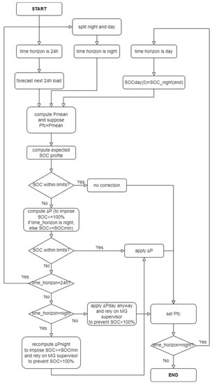 As stated before, the EM algorithm is executed in normal operating conditions to compute optimal power references that allow the FC to operate as much as possible at constant power near the operating point decided by the MG designer while respecting Requirements 2, 3, and 4. The simplest way to achieve this goal is to consider the forecasted power demand for the next 24 h, extract its average value, and provide it as a reference to the FC converter. However, this approach may not ensure compliance with the battery’s maximum and minimum SOC limits. For example, SOC limits could be violated when extended charging (discharging) periods are required starting from a very high (low) initial SOC. Furthermore, even considering an initial SOC of 100% (or ) at the beginning of the day, the energy to be exchanged in the discharging (or charging) phase may exceed the usable capacity of the battery, i.e., . For the above reason, a more sophisticated rule-based EM algorithm was devised to ensure compliance with SOC limits by reshaping the daily SOC profile when needed. Since the load demand profile is cyclical, it is possible to assume midnight as the daily cycle’s starting time and consider 8 h/16 h as the duration of the night/day periods.