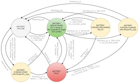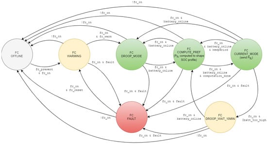 The MG supervisor was implemented using a couple of Finite State Machines (FSMs), i.e., one for the FC and one for the battery. The operation of these FSMs in the four foreseen operating conditions is described by the state diagrams shown in Figure 6 and Figure 7. In these diagrams, the states are colored according to the following criterion: gray = device not active or not present; green = operating condition that can last indefinitely; yellow = temporary operating condition; red = fault condition.