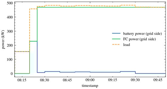 It can be observed that once the FC was in FC_CURRENT_MODE, it supplied the load with the power calculated by the EM algorithm, whereas the battery (controlled in droop mode) provided the remaining load power. The droop control of the battery resulted in MG voltage variations that are much smaller than 5% of the nominal voltage (1 kV DC), guaranteeing stable operation.