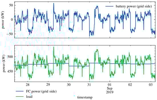 The MG operation was simulated over a 7-day period. Figure 10 shows the obtained grid-side power profiles of the sources and load. The FC supplied constant power until midnight of the first day. Then, for each new day, the FC FSM received the newperiod signal, and the recalculation of the power reference value of the FC was triggered. It can be observed that, in the considered period, the EM algorithm found no need to apply the reshaping procedure for day and night independently. Therefore, a single power reference value was chosen for each simulated day. Figure 10 also shows the behavior of the battery that took charge of the load demand fluctuations around the power supplied by the FC, also compensating for forecasting errors. Again, the voltage variations were well below 5%, guaranteeing stable operation.
