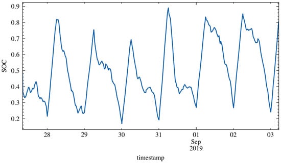 The obtained battery SOC profile is plotted in Figure 11 and shows that the SOC constraints were satisfied. Moreover, it is worth observing the almost complete cycles of charge and discharge that repeat daily. These confirm the correct operation of the EM algorithm and the correct sizing of the battery.