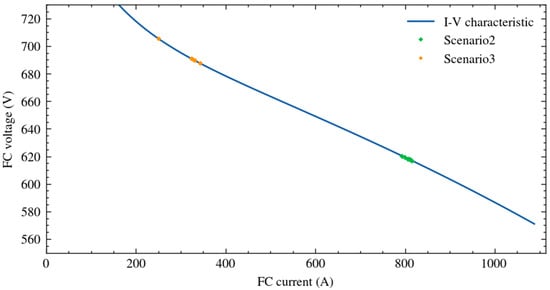Simulated FC operating points superimposed to the FC’s I-V characteristic in Scenarios 2 and 3.