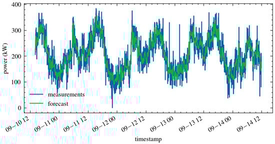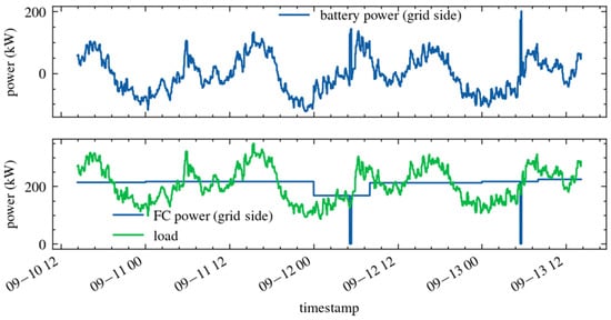 As in the previous scenario, the simulation was performed considering that the grid energization procedure was completed. Thus, the FSM of the battery started in BATTERY_DROOP_MODE, and the FSM of the FC started in FC_CURRENT_MODE. The measured and forecasted load demand profiles over a multi-day period are depicted in Figure 13. It can be observed that the mean power value was lower than in the previous scenario. In contrast, the variations with respect to the mean power were larger.