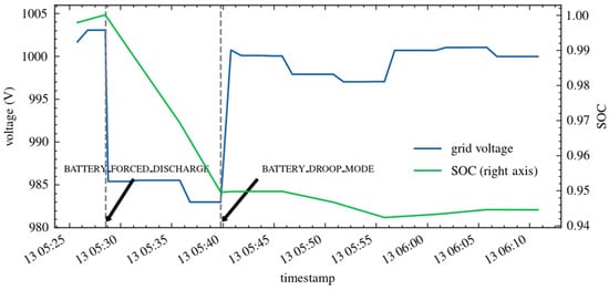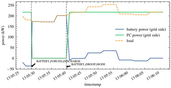 Figure 14 also shows two short time intervals of about 10 min each where the FC power was zero. These events occurred because the forecasting errors were purposely increased to test all the features of the EMS. During these events, the battery FSM bypassed the power reference for the FC and forced battery discharge. The second of these intervals (zoomed in Figure 15) is further analyzed in the following. The load demand was lower than the forecasted load, causing battery SOC to reach the upper limit more rapidly than expected. When battery SOC reached 100%, a transition of the battery FSM to BATTERY_FORCED_DISCHARGE was triggered, thus imposing a null power reference for the FC. Figure 15 highlights the time of such transition and shows the automatic increase of battery power (thanks to the droop control), which is necessary to satisfy the load demand ensuring power balance. The corresponding variations of grid voltage and battery SOC are shown in Figure 16.