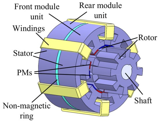 The topology of the AM-FRPM machine comprises two modular units with the same front and rear structures, as shown in Figure 1. The stator consists of two axially distributed stator module elements with the same structure, and a magnetic separation ring is embedded between the two modular units at the front and back of the stator to reduce the axial magnetic leakage of the AM-FRPM machine. The topology of the AM-FRPM machine module unit is similar to the conventional FRPM machine structure, as shown in Figure 2. The toroidal armature winding is wound in the stator yoke, which is composed of two modular units to improve the machine winding factor and the machine torque density. The two PMs of the stator teeth of the two modular units at the same position have opposite magnetization directions. An air gap is created between the two permanent magnets under the surface of the tooth of the same stator module to suppress torque ripple. The difference between the spatial positions of the rotor teeth of the front and rear rotor modules is π/Pr (where Pr is the number of rotor teeth; Pr = 8 in this paper), which is used to eliminate even harmonics in the permanent magnet flux, improve the sinusoidal characteristics of the no-load permanent magnet flux waveform, and reduce torque ripple.