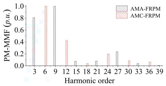 For the PM-MMF analysis, the geometric parameters of AM-FRPM machines with different magnetization methods are considered to be the same. Thus, the PM-MMF amplitudes FPM-AMA and FPM-AMC are identical. According to Equations (5) and (8), the amplitude of the ninth harmonic in the AMA-FRPM machine is 0.85 times that of the sixth harmonic in the AMC-FRPM machine, which is verified by the FEA shown in Figure 6 and Figure 7.
