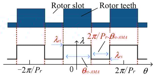 The rotor permeance model for the front and rear module units is shown in Figure 5, where θrt-AMA is the rotor tooth width, and λrt and λrs are the air-gap permeances of the rotor teeth and rotor slots, respectively. The front modular unit rotor permeance λf-AMA and rear modular unit rotor permeance λr-AMA are expressed as: