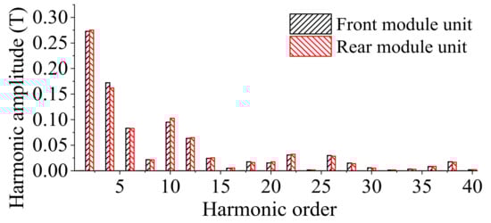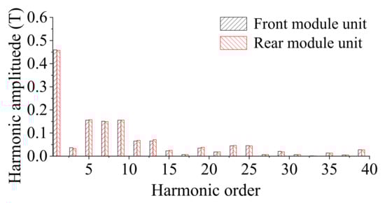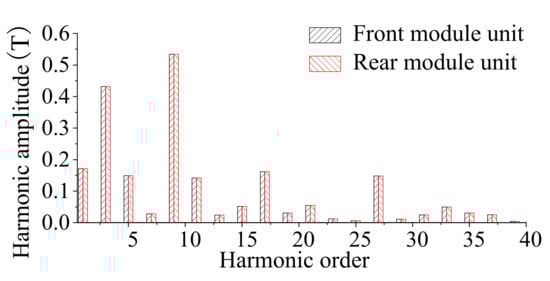 The harmonic distribution of the air-gap flux density can be obtained from Equation (5). The main harmonic orders are |nPs/2 ± kPr| (n = 1, 3, 5…, k = 0, 1, 2…). It can be seen that the harmonics with orders of nPs/2 are mainly generated by the PM-MMF, and the harmonics with orders of |nPs/2 ± kPr| are produced by the field modulation effect of the salient rotor teeth. In addition, the amplitudes of the third (0.43T) and ninth (0.54T) harmonics are the largest (nPs/2, n = 1, 3), which further affects the contribution of the harmonic torque. Figure 6 shows the PM flux density harmonic distributions for the front and rear module units, verifying the analytical results for the PM field modulation in AMA-FRPM machines.