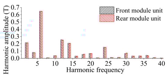 According to Equations (22) and (24), the main harmonic numbers for the armature reaction air-gap flux density are |kPr ± i|, (i = 2, 4, 8…, k = 0, 1, 2…), which are even. The ith harmonic (excluding multiples of three) is directly generated by the armature reaction MMF, while the rotor salient-pole modulation mainly generates the |kPr ± i| harmonic. Figure 14 shows the air-gap flux density harmonic distributions for the armature magnetic fields of the front and rear module units of the AMC-FRPM machine. The correctness of the armature reaction magnetic field modulation analytical results is verified.