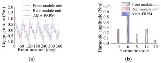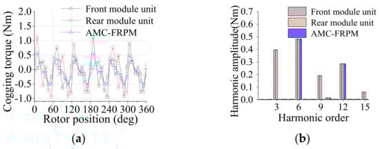 According to Equations (10) and (11), the cogging torques of the front and rear module units are opposite when k is an odd number. The harmonics with odd orders in the cogging torque are then canceled. The Ps/Pr combinations for AM-FRPM machines with cogging torque harmonic suppression are listed in Table 1. For 6s/8p AM-FRPM machines, the prominent harmonics of the cogging torque are the multiples of three and the odd harmonics cancel each other, as shown in Figure 8 and Figure 9. In addition, the cogging torques of AMA-FRPM and AMC-FRPM machines are 1.2 Nm and half that of the single-module machine. Therefore, the 6s/8p AM-FRPM machines with a modular structure have lower cogging torque.