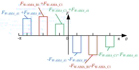 AM-FRPM machines utilizing AMA and AMC methods employ toroidal armature windings, as shown in Figure 1. The armature reaction MMF distributions are different from those of FRPM machines with concentrated windings. Thus, the armature reaction air-gap MMF FWg_gap for the AMA-FRPM machine can be analyzed using the armature reaction magnetic circuit, as shown in Figure 10. Here, FW-AMA_A1 and FW-AMA_B1 are the armature reaction MMFs, ψa is the armature reaction flux linkage, and Λgap is the air-gap magnetic permeability. Equation (13) is the armature reaction MMF equation for the AMA-FRPM machine. The armature reaction air-gap MMF distribution can thus be obtained, as shown in Figure 11.