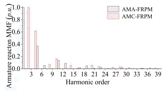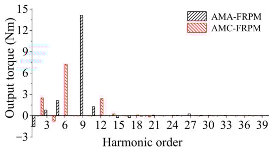 - With regard to the armature reaction air-gap flux density, the amplitude of the ninth (nPs/2 (n = 3)) harmonic in the AMA-FRPM machine is 1.85 times that of the sixth (nPs, (n = 1)) harmonic in the AMC-FRPM machine. Moreover, the corresponding difference in the harmonic amplitudes between the PM magnetic fields of the two machines is only 15%. The ninth harmonic of the AMA-FRPM machine generates higher output torque, 1.92 times that of the sixth harmonic of the AMC-FRPM machine, with a better harmonic utilization rate;