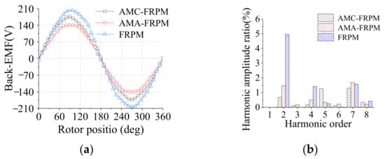 The FRPM machine’s back-EMF amplitude was 203.5V, as shown in Figure 16, which was 15.3% and 45.0% higher than those of the AMC-FRPM and AMA-FRPM machines, respectively. In addition, the harmonic content of the back-EMF of the AMC-FRPM machine was 2.1%, which was 0.3% and 3.4% lower than those of the AMA-FRPM and FRPM machines.