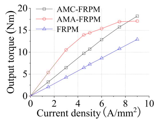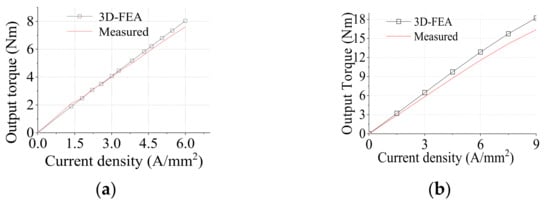The output torques for the two machines with different current densities are shown in Figure 23. It can be seen that the simulated and the measured values had good consistency. At the rated current density of 5 A/mm2, the measured output torque of the AMC-FRPM machine was 9.5 Nm, which was 0.66 Nm lower than the 3D FEA result. Moreover, the output torque of the FRPM machine measured at the same current density was 6.6 Nm, which was 0.1 Nm lower than the 3D FEA result. Through the experimental analysis, the correctness of the previous research was verified.