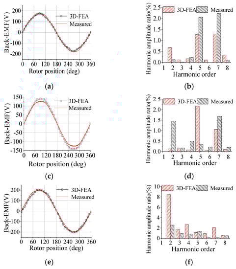 Back-EMF waveforms for the two types of machines. (a,b) AMC-FRPM machine. (c,d) AMA-FRPM machine. (e,f) FRPM machine.