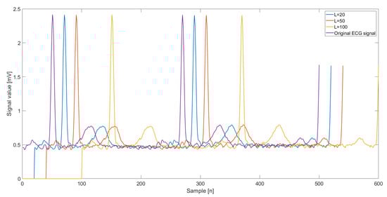 Figure 2 presents the influence of increasing the length L of vector on the quality of the filtering, taking into account the delay that results from the collection of L samples of the processed signal.