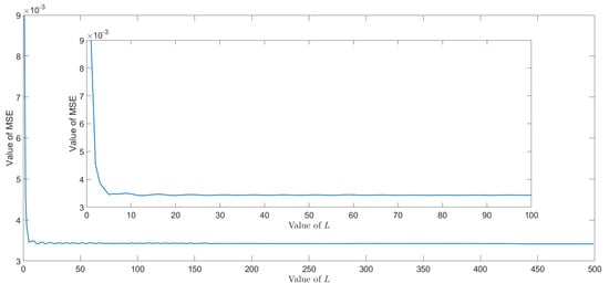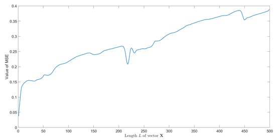 The MSE between the filter response and the undistorted signal as a function of the length L of the vector .