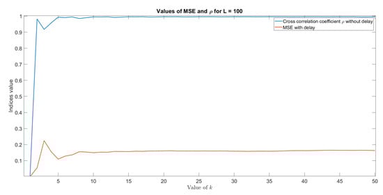 In the first proposed method, the benefit of delaying the filter response by only two samples comes at a cost of a significant increase in the number of required calculations. In order to reduce the complexity of these calculations, a second approach is proposed. In this approach, the matrix has a constant dimension of and the projection operator has a dimension of , as presented in Equations (16) and (17). To select the value of the factor k that determines the size of the matrix , and also the delay in the start of the filtering process, the following method is proposed. The MSE between the filter response and the noise-free signal is determined using a simulation process including the delay at the start of the filtering process. In addition, the cross-correlation coefficient is determined according to Equation (12). When calculating the coefficient, the delay arising from the need to record k samples of the signal before filtering is not taken into account. The coefficient describes how similar the filter response is to the signal without interference. In order to select a value for k, one should choose one that provides a filter response shape that is most similar to the signal without interference, while ensuring the least delay to the start of the filtering process. Figure 4 presents the MSE and indices when and k varies from 2 to 50.