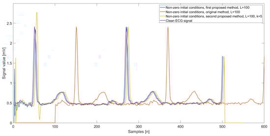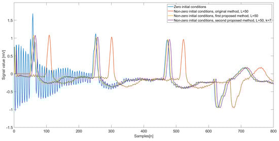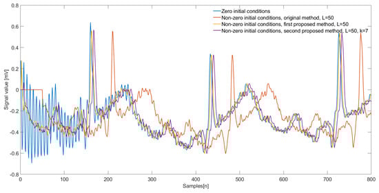 Figure 5 presents the results of filtering the ECG signal using the notch filter with non-zero initial conditions determined with the aid of the methods proposed in the paper and the method from Ref. [15]. For a comparison, a distortion-free ECG signal is also depicted.